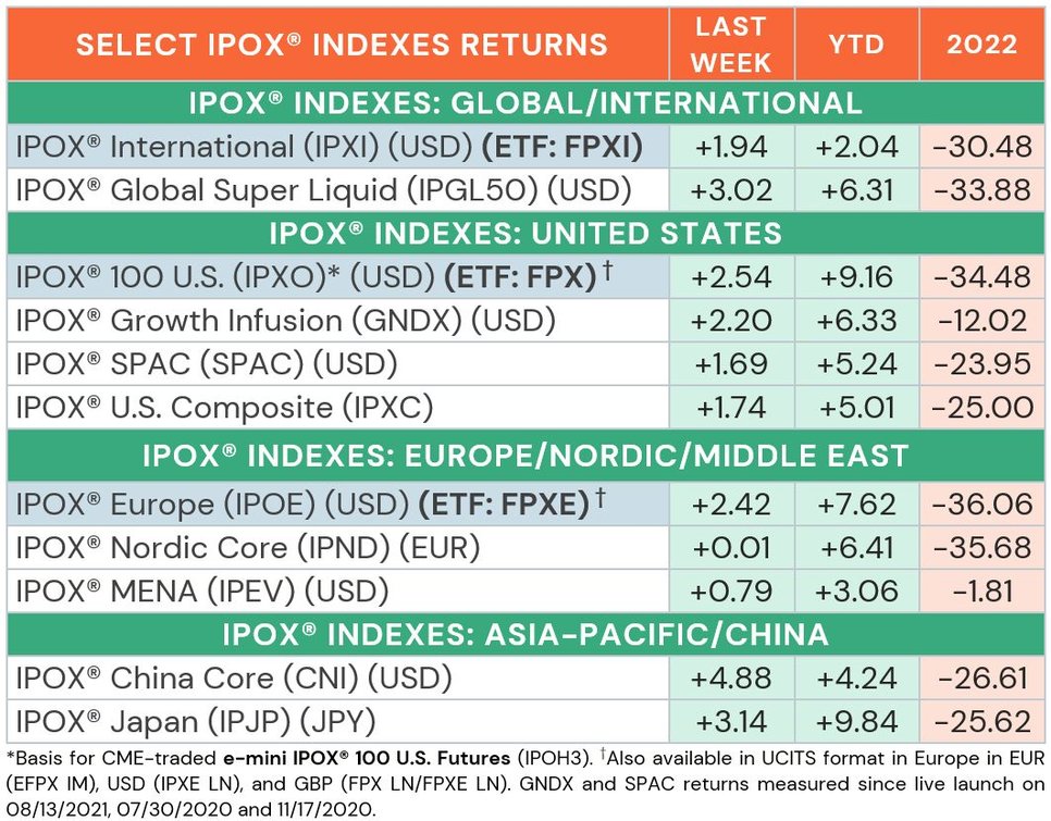 IPOX® PORTFOLIO STOCKS IN FOCUS:The IPOX® 100 U.S. (ETF: FPX) upside performance was driven by outliers with large swings after earnings, e.g. “Internet of Things” firm Samsara (IOT US: +21.45%), payment processor Shift4 (FOUR US: +24.97%) and DevOps firm GitLab (GTLB US: +20.53%). Quarterly reports also impacted health care providers Agilon Health (AGL US: +19.41%) and industry peer Alignment Healthcare (ALHC: -18.02%). Cloud-based education provider Powerschool (PWSC: -13.89%) dropped after announcing a secondary offering. The IPOX® Europe (ETF: FPXE) was led by Italian pharmaceutical glass ampule maker Stevanato (STVN US: +18.91%), while compatriot chip testing firm Technoprobe (TPRO IM: -13.37%) fell on weak outlooks. The biggest movers in the IPOX® International (ETF: FPXI) included resurging Chinese agri-food e-commerce firm Pinduoduo (PDD US: +14.30%), Israeli solar power equipment developer SolarEdge (SEDG US: +10.35%) and Chinese online education firm Koolearn (1797 HK: -11.27%).