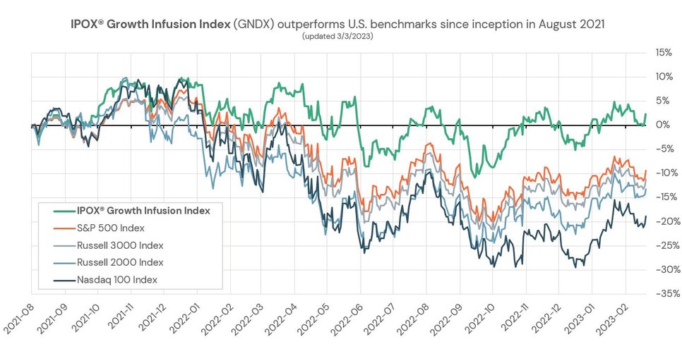 WEEKLY IPOX® PERFORMANCE REVIEW: U.S. equities saw the best week since late January after surging on Friday, as yields on the benchmark 10-year U.S. Treasury notes dipped back below the key 4% level. The IPOX® Indexes started the month with strong performances, outperforming major benchmarks anew. In the U.S., e.g., the IPOX® 100 U.S. (ETF: FPX) surged +2.54% to +9.16% YTD as big post-earnings rallies in select small- and mid-cap holdings pushed our index past the S&P 500 (ETF: SPY) for the 5th week, taking another +61 bps. from the U.S. benchmark. Globally, the IPOX® Europe (ETF: FPXE) climbed +2.42% to +7.62%, overtaking the STOXX Europe 50 YTD to +56 bps. outperformance. Backed by strong showings in Europe as well as the rebounding IPOX® China (CNI: +4.88%) and IPOX® Japan (IPJP: +3.14%), the IPOX® International (ETF: FPXI) gained +1.94% to +2.04 YTD. The unique IPO M&A portfolio strategy of our super-liquid large cap IPOX® Growth Infusion (GNDX: +2.20%) continues to pay off well against key benchmarks (see below).